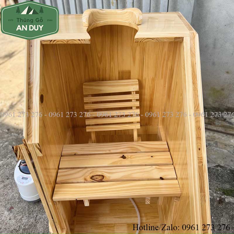 + Thùng xông có dáng hình chữ nhật, dáng ngồi rất thoải mái. Thùng được làm nắp mở dễ dàng, có cửa bước vào và có ghế ngồi tựa lưng.